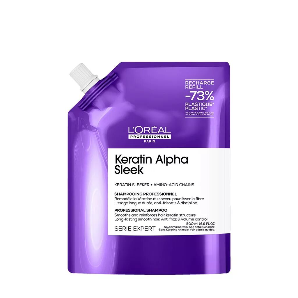 Le Shampoing Disciplinant sans sulfate Keratin Alpha Sleek de L'Oréal Professionnel adoucit et hydrate les cheveux, leur apportant une brillance instantanée et un contrôle du volume et des frisottis. La routine permet d'obtenir 2 semaines d'anti-frisottis* et de douceur* pour un coiffage quotidien 3x plus rapide**.